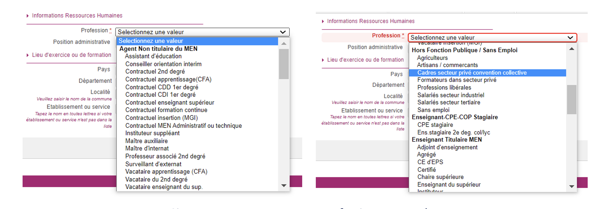 Sur la page suivante, vous devrez renseigner votre profession. Si votre profession n’est pas dans la liste, vous devez choisir celle qui correspond le plus à votre situation au moment de l'inscription. Si l'intitulé exact de votre profession n'est pas dans liste proposée, certains intitulés peuvent peut-être convenir. Cela n'a aucun impact sur votre inscription et le passage du concours.