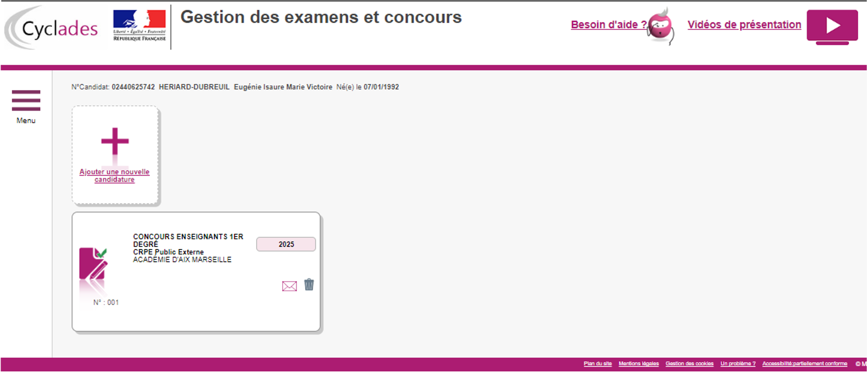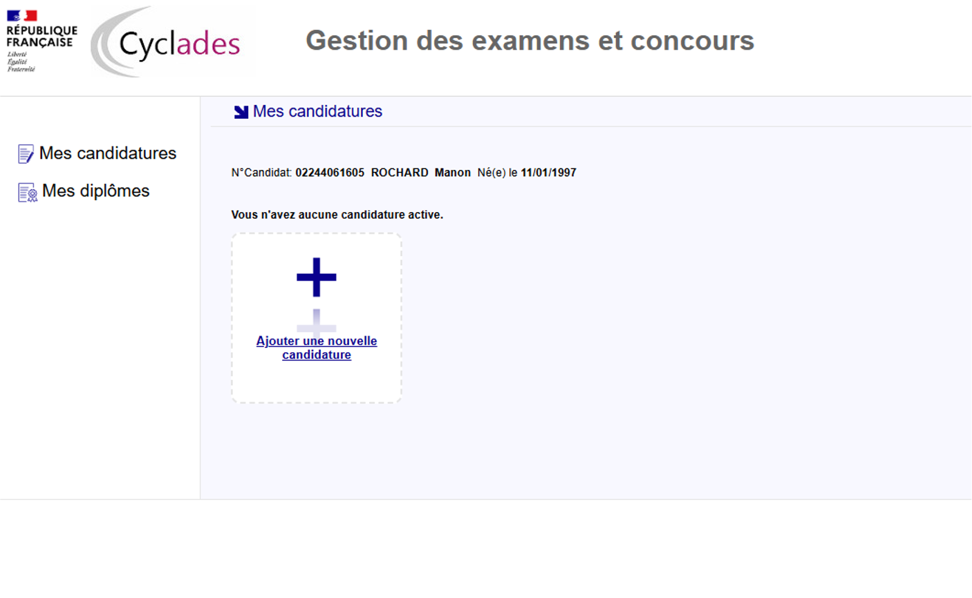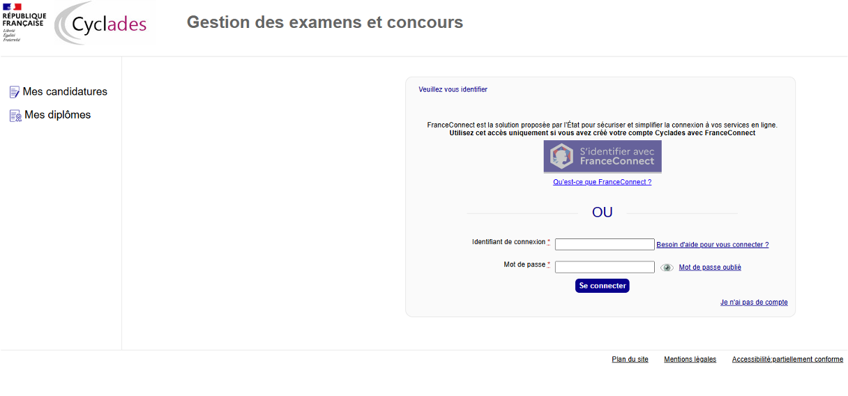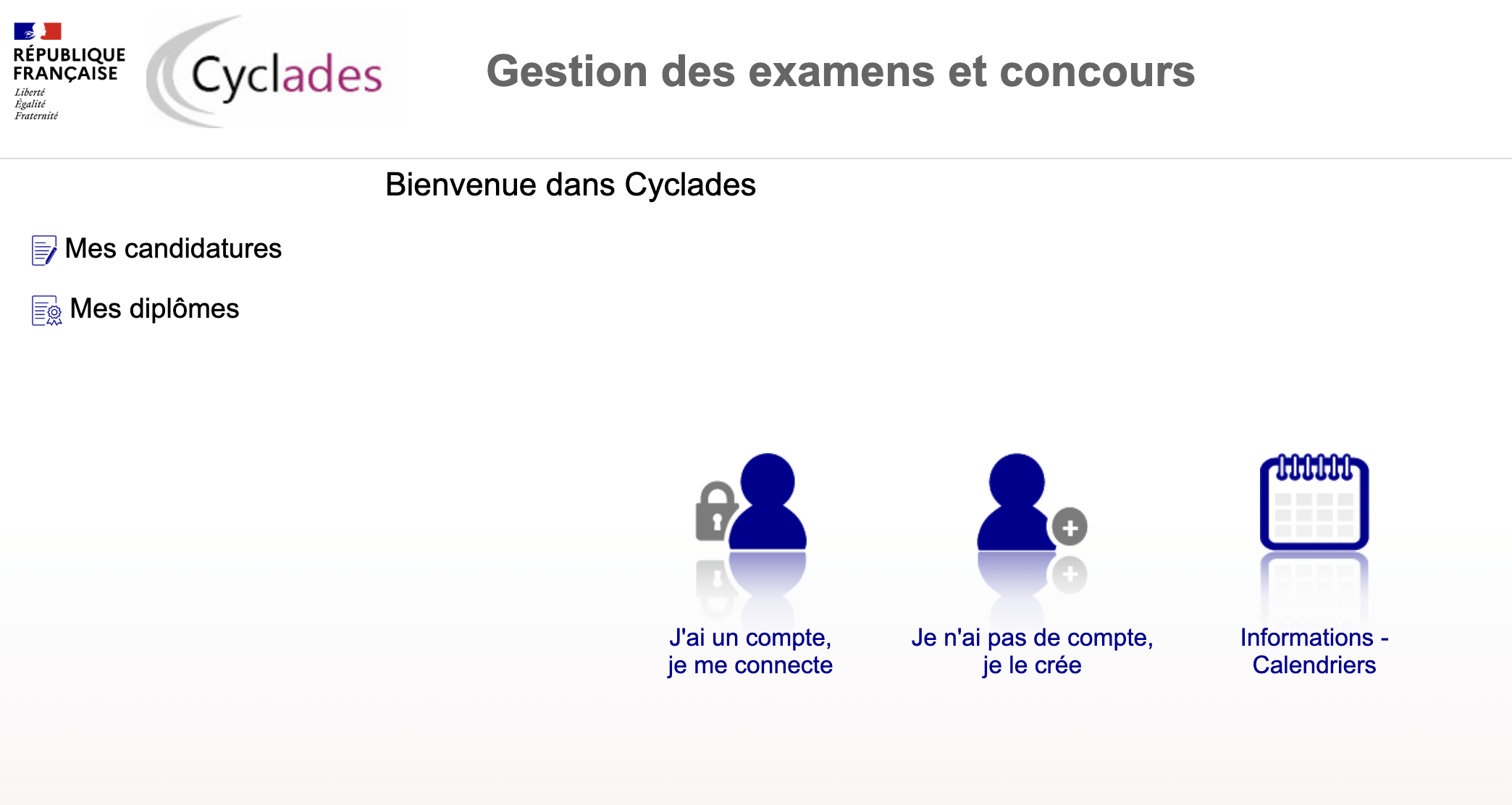 Le site d’inscription Cyclades : https://candidat.examens-concours.gouv.fr/cyccandidat/portal/accueil?codeER=&domaine=
