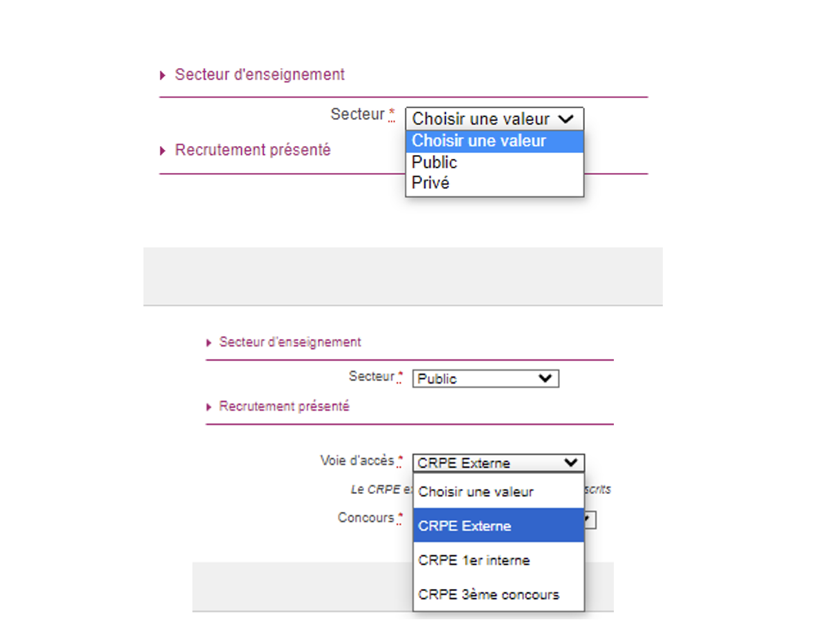 La page suivante concerne votre choix de concours public ou privé. En fonction de ce choix (public ou privé), vous pourrez sélectionner les concours correspondants qui existent dans votre académie.