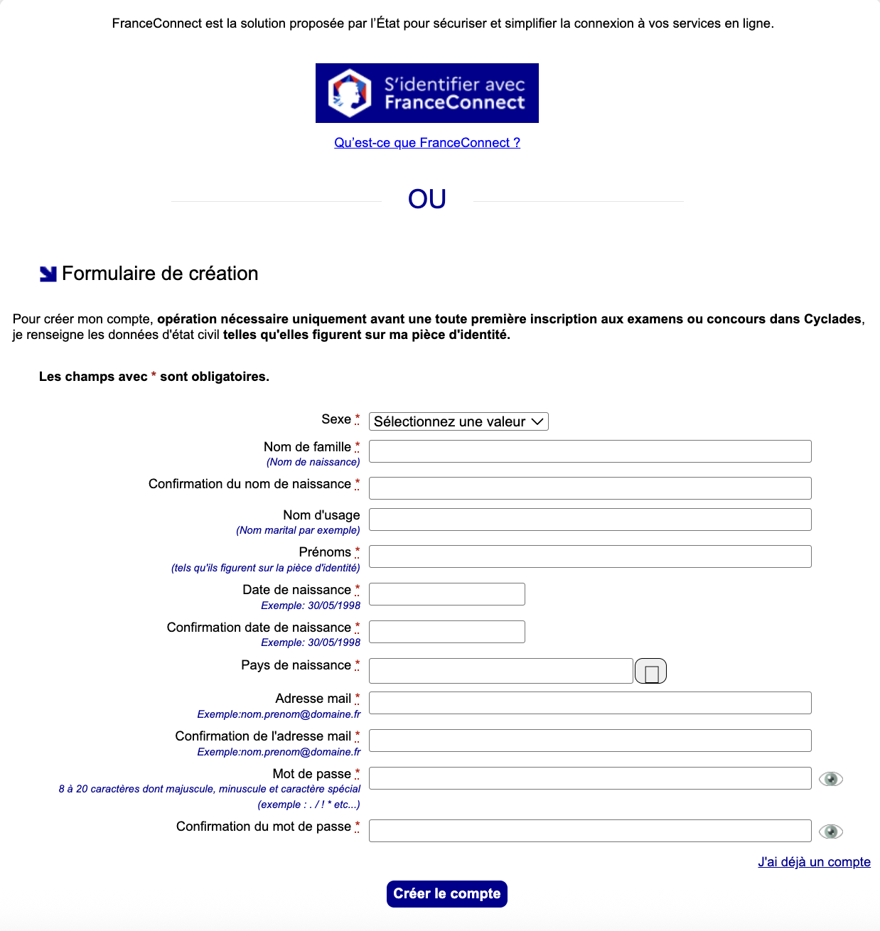 Pour la création du compte, vous devez remplir toutes les informations. Vous pouvez aussi utiliser France Connect pour aller plus vite !