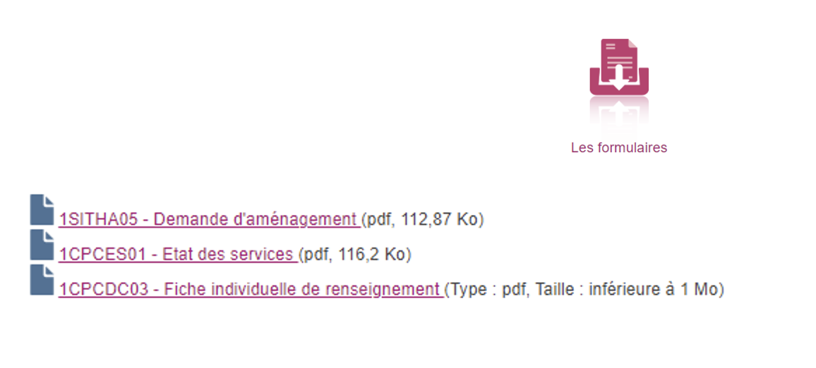Dans « Les formulaires », vous trouverez : le formulaire à remplir par le médecin pour les demandes d’aménagement des épreuves, formulaire pour l’état des services (expérience professionnelle) pour le troisième concours et le second concours interne et enfin la fiche individuelle de renseignement