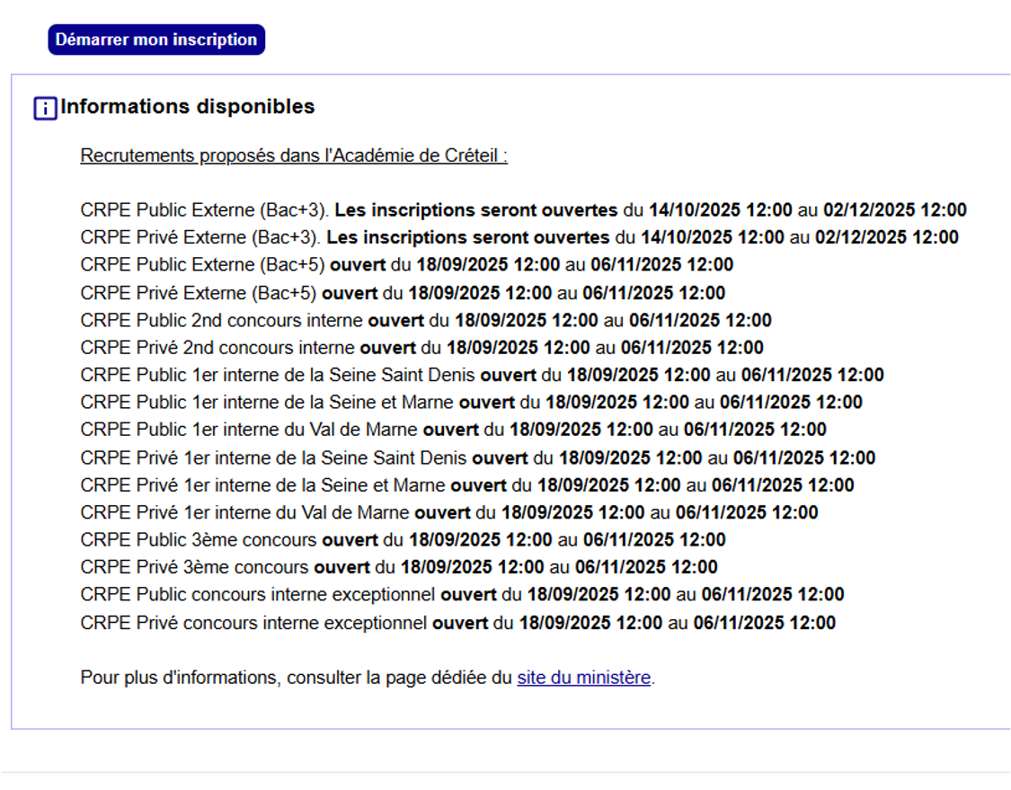 En haut de la page, après avoir sélectionné l’académie de votre choix, cliquez sur Démarrer mon inscription ici (en bleu). Vous accéderez alors à la liste des concours disponibles (exemple : Créteil). Si le concours auquel vous souhaitez vous inscrire n’apparaît pas, c’est sans doute qu’il n’est pas ouvert pour cette session.