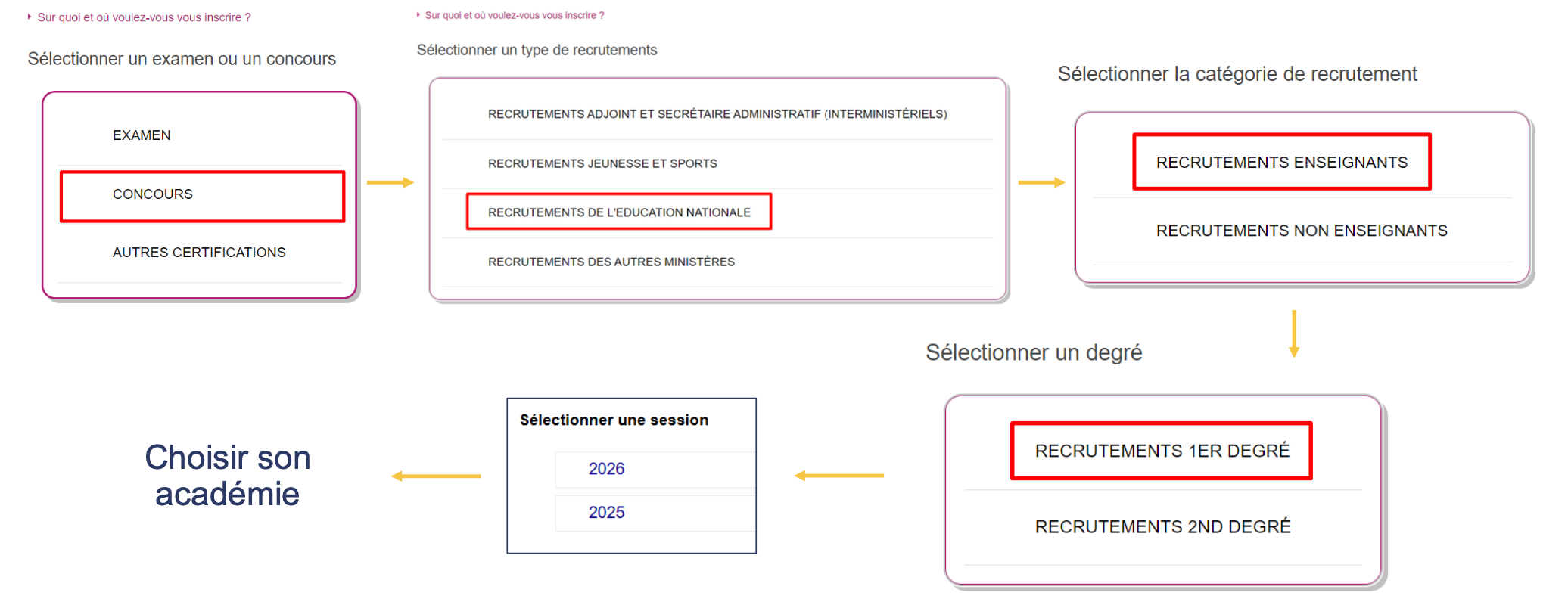 Attention : tous les concours ne sont pas ouverts chaque année dans toutes les académies. Cela dépend s’il y a des postes ouverts dans votre académie sur ce concours en particulier. Vous aurez cette information au moment de votre inscription (après avoir sélectionné votre académie, le site vous proposera les types de concours disponibles).