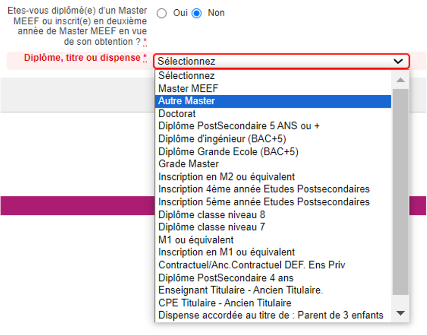 La page suivante concerne votre formation. Lorsque vous êtes inscrit au CRPE externe ou interne, vous devez justifier d’un certain niveau, d’un certain poste ou d’une dispense. C’est ici que les parents de 3 enfants devront sélectionner « Dispense accordée au titre de : Parent de 3 enfants ».