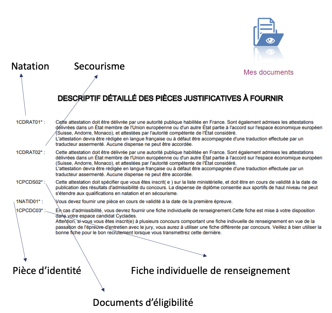 Enfin, dans « Mes justificatifs », vous devrez déposer tous les documents pour justifier et valider votre inscription au concours, y compris les attestations de natation et de secourisme. Vous trouverez également les dates limites d’envoi des documents, à respecter absolument dans l'encadré gris en haut ! I Ici l’exemple de l’académie de Créteil.