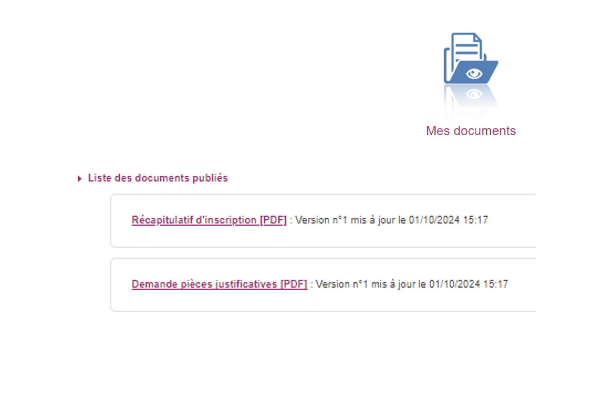 Dans « Mes documents », vous retrouverez le récapitulatif d’inscription et la demande de pièces justificatives.